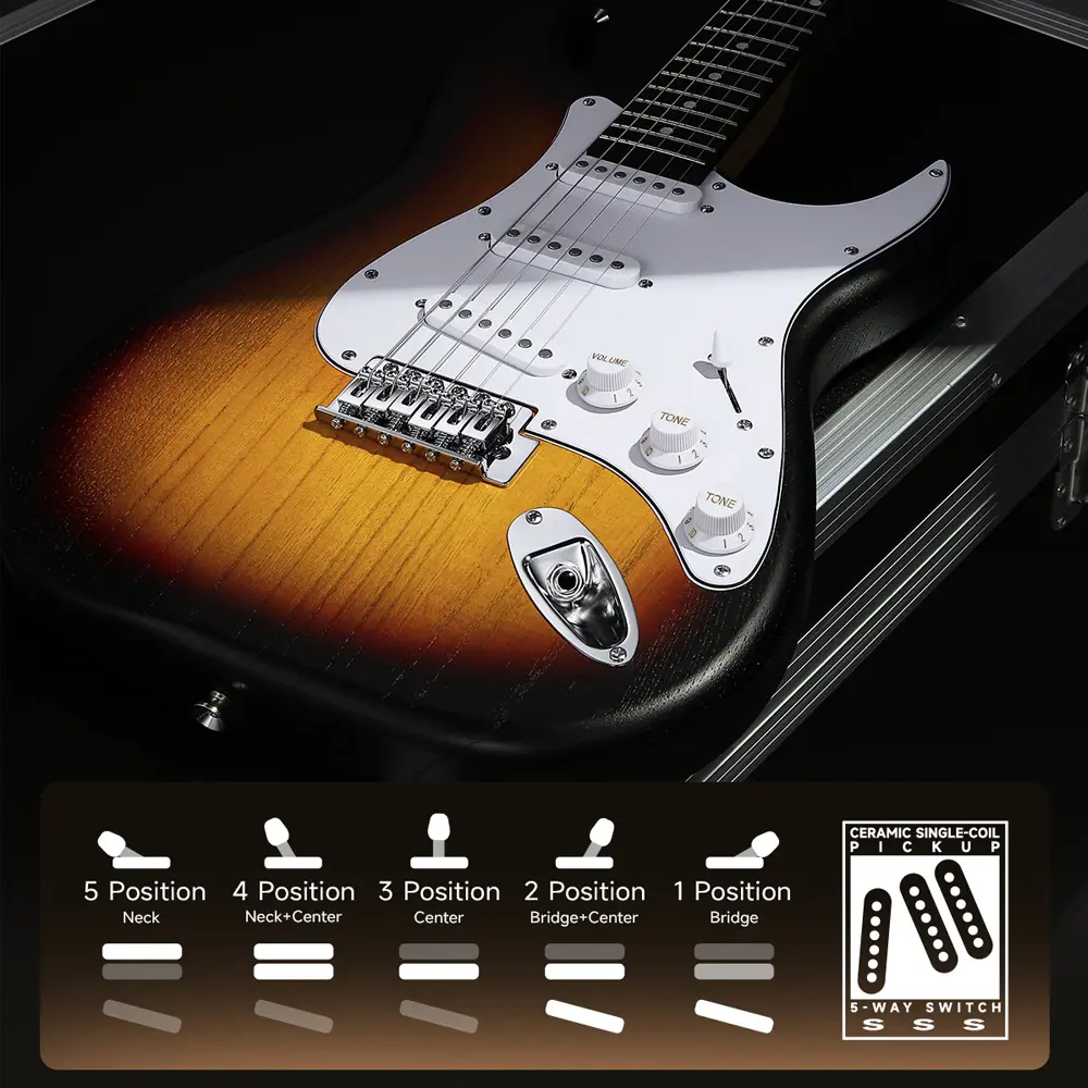 - All-in-One Starter Set – Includes electric guitar, 5W amplifier, gig bag, strap, tuner, capo, cable, picks, and extra strings for a complete out-of-the-box experience.